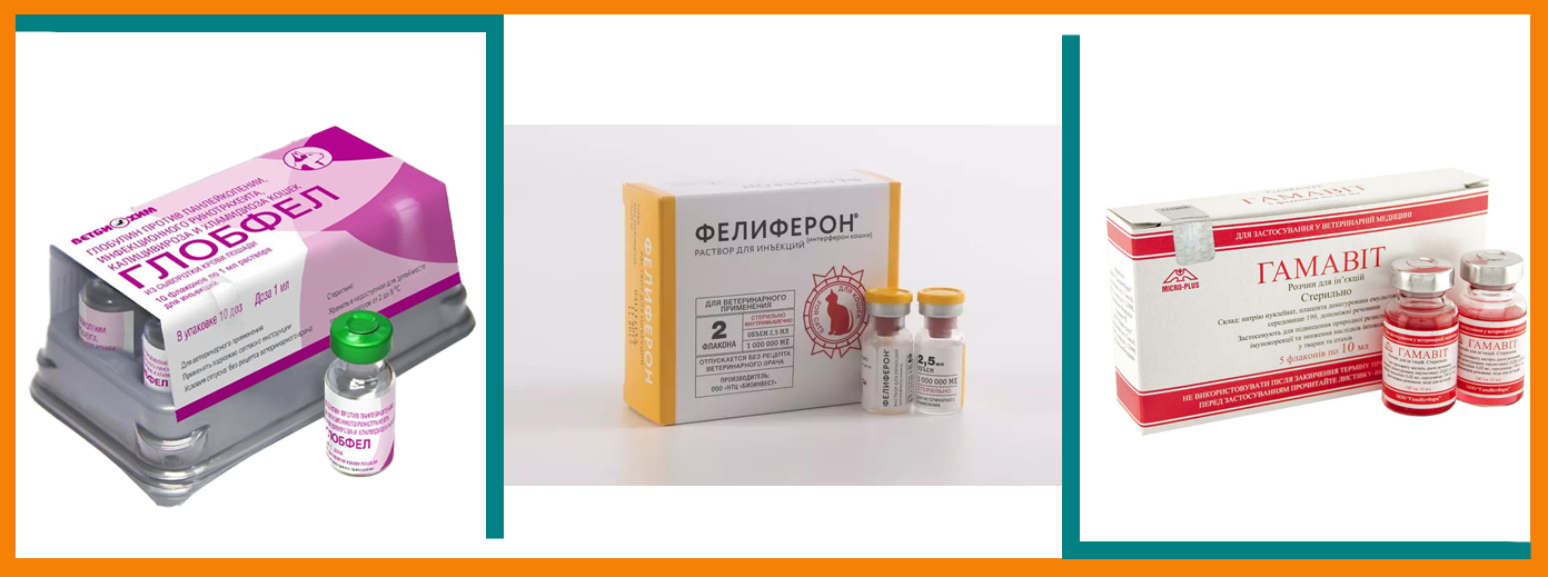 | Глобфел (Globfel) | Произход: Русия. Състав: Пречистени, концентрирани инактивирани антитела (имуноглобулини) срещу вирусите на панлевкопенията, ринотрахеита и хламидията. | Осигурява пасивен имунитет, който започва веднага и продължава около две седмици. Приложение: Използва се както с лечебна, така и с профилактична цел (напр. при котенца с неясен имунен статус). |